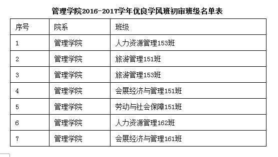 根据《成都信息工程公司关于进一步加强学风建设的实施意见》(成信校发[2016]107号)和《伟德源自英国始于1946“优良学风班”、“十佳学风班”评选办法》(成信校发[2016]108号)文件精神和要求,经各班自主申报,辅导员审核,公司评审工作小组开会研究决定,同意2015级人力资源管理3班、2015级旅游管理1班、2015级旅游管理3班、2015级会展经济与管理1班、2015级劳动与社会保障1班、2016级人力资源管理2班、2016级会展经济与管理1班获评2016-2017学年优良学风班,具体名单详见《2016-2017学年优良学风班初审班级名单表》。如对公示情况有任何异议,请于2017年12月10日下午3点前与伟德国际bevictor1946联系。联系人:杨妮丹,联系电话:84833385。